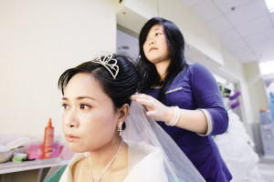 化妝、戴睫毛、換婚紗、做頭發(fā)……昨日,家住袁家崗附近的39歲未婚女陳蕓,在本報記者的幫助下第一次穿上了婚紗,拍照時露出了久違的笑容。21歲那年,由于自己找的男友不是“吃皇糧”的被母親反對,陳蕓開始了18年漫長的相親生活。屢次失敗后,絕望的她選擇了跳樓和絕食,幾次自殺未果。