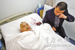 經(jīng)過3小時(shí)手術(shù)和24小時(shí)術(shù)后觀察,昨日傍晚,大坪醫(yī)院傳來好消息:前日上午不幸被高空墜落的鐵頭叉棍插進(jìn)頭顱的袁正敏,成功度過第一段生命危險(xiǎn)期。