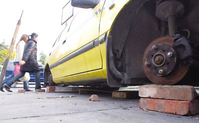昨天下午2時許,記者在朝天門湖廣會館附近一露天停車看到,該停車場內(nèi)竟然有10多輛車子沒有輪胎,4個輪胎部位墊的是磚頭支撐車身。停車場管理員稱,這里停放的車輛多為交警部門暫扣的一些違法車輛和“黑車”。為了防盜,停車場管理人員曾想過不少辦法,效果不太好。