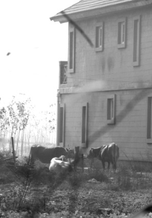 走到別墅區(qū)的中央,三頭牛正在別墅旁悠閑地吃草,繩子就拴在別墅的窗戶上?莶、牛糞混雜在一起!昂廊A別墅區(qū)成了牛欄!”一名路人見狀不無戲謔地大聲說。
