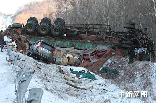 事故現(xiàn)場,一輛大貨車輪子超天側(cè)翻在路邊的深溝中,駕駛室嚴重扭曲變形,車上3人被困,路基下還有一輛長城吉普車,但該車體并沒有大礙,只是車內(nèi)人員輕微受傷。在此高速公路段,由于這輛事故大貨車滑入路邊的溝中,后面的多輛車見狀立即采取緊急制動剎車,一輛載滿一車乘客的麒麟集團的大客車從下坡發(fā)現(xiàn)就開始制動,由于路面濕滑,大客車失控在路中來回擺動最終滑出200米橫在路中,車內(nèi)乘客虛驚一場,所幸車內(nèi)并沒有乘客受傷,這時另一輛大貨車從上坡下來看見大客車橫在路中,司機也立即采取制動,將車撞向路中的隔離護欄,避免了一起重特大事故發(fā)生,在該貨車的后面100米,還有兩輛轎車不程度受損。