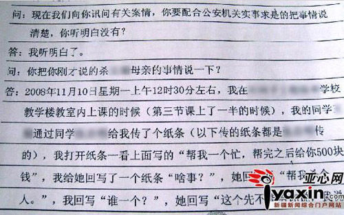 圖為警方審訊筆錄。內(nèi)容顯示莎莎和亮亮用紙條商量殺害莎莎母親。