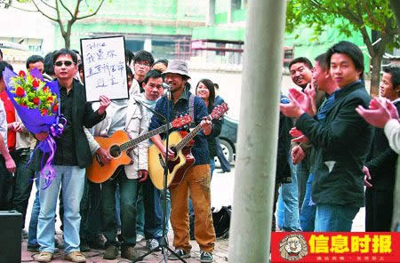 一名男子手持玫瑰花、高舉求愛(ài)宣言,并邀來(lái)樂(lè)隊(duì)助陣高唱情歌。昨日上午,珠江新城華利路附近某小區(qū)門口的新奇場(chǎng)面引來(lái)眾人圍觀。求愛(ài)男子自稱是在網(wǎng)上看到女主角所在單位為其做的征婚廣告,專程從哈爾濱趕來(lái),并想出這個(gè)主意以期望感動(dòng)對(duì)方。圍觀者紛紛質(zhì)疑這場(chǎng)“求愛(ài)秀”是商業(yè)單位的宣傳炒作。