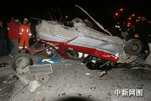 轎車一側(cè)停放著一輛中型貨車,駕駛室受損較輕,前擋風(fēng)玻璃已經(jīng)破碎。距離轎車西面30多米處,一輛出租車停在馬路中間的護(hù)欄旁,出租車已經(jīng)被撞的支離破碎,車底朝天,兩個(gè)后輪胎掉在地上,地上撒滿了汽油。馬路中間一根護(hù)欄上的水泥墩由于受到巨大的撞擊力,也被“連根拔起”,出租車內(nèi)一男子駕駛員被壓在車底,無生命跡象。