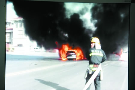 由于擔(dān)心車內(nèi)還有人被困,侯隊(duì)長立刻派3名隊(duì)員和一輛高噴車從不同角度滅火。5分鐘后火勢基本上被控制,消防隊(duì)員查看后發(fā)現(xiàn)車內(nèi)并無被困人員。“心總算放回肚子里去了。”侯隊(duì)長說,七八分鐘后大火就被全部撲滅。