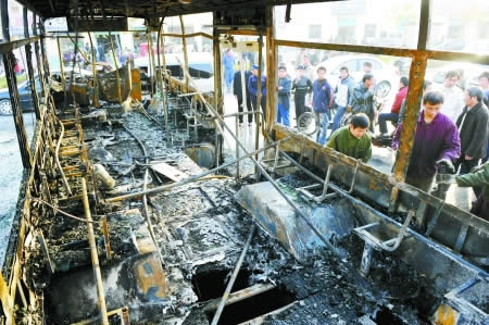 下午3時(shí)許,出事的白色奇瑞已被拖離現(xiàn)場,被燒壞的公交車趴在地上,外胎已被燒化粘在地上,車內(nèi)的坐椅、玻璃也在大火中全部燒化,整個(gè)車體只剩下一個(gè)框架。“乖乖,鋼板都燒化了!币幻麌^者舉著兒子使勁往前湊。