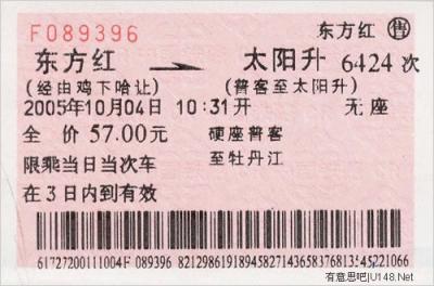 “東方紅”站位于現在虎林市與饒河縣之間的密東鐵路的盡頭站,而車票中顯示的“太陽升”站,是位于黑龍江省大慶市大同區(qū)太陽升鎮(zhèn)的“太陽升”火車站。這張2005年的車票顯示,由“東方紅”至“太陽升”需要經過多次轉車,而售出這張車票的是“東方紅”火車站。水妖昨日打電話詢問該站工作人員得知,票上的“雞下哈讓”分別代表4個中轉地:雞西、下城子、哈爾濱、讓湖路。這樣的車票現在還可以買到,不過當年的車次已經改變,現在這條路線的車次應該是6224次。