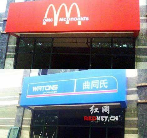 “曲同氏(假冒屈臣氏)、必勝糊(假冒必勝客)、李明(假冒李寧)、巴克星(假冒星巴克)、哈根波斯(假冒哈根達斯)……”一條掛滿“山寨”招牌的商業(yè)街驚現(xiàn)南京文安街,這條被網(wǎng)友稱為史上最雷的“山寨一條街”,于掛出招牌后沒幾天在工商部門的干預(yù)之下消失了。(11月9日 紅網(wǎng))