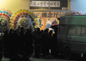 昨晚,昭通市昭陽區(qū)殯儀館燈火通明,擺滿了祭奠凌光輝的花圈,多數(shù)為政府機(jī)關(guān)所祭,市、縣兩級相關(guān)領(lǐng)導(dǎo)干部及凌光輝的親戚朋友在等待著凌光輝的靈車。直到晚8點,靈車才開進(jìn)殯儀館,警車開道,一輛急救專用車載著凌光輝的靈柩進(jìn)入殯儀館,15分鐘后,把靈柩安放進(jìn)靈堂。