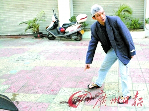 昨天上午,記者接報料后趕到事發(fā)地三水西南街道三達路冰皇咖啡館門前,一瘦小個男子頭部打著紗帶,血跡印紅了紗布,男子的牛仔褲上仍有血跡,地上有一攤已經(jīng)干了的血跡及零星血點。該男子告訴記者,他就是昨晚被打之人,他叫蘇成營,今年34歲,是肇慶封開縣長按鎮(zhèn)人,在三水做裝修工作。