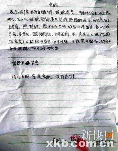 新快報記者接到的這份“聲明”全文如下:“我于2007年農(nóng)歷8月至九月,跟蹤老虎,9月二十七日在山上住兩天,下小雨,跟蹤腳印,只到吃野豬的現(xiàn)場,看見虎的后半身,照到的,照相機不行,沒有沖洗出來,是一只成年虎,是母虎,因為腳印大。10月3日前,我一直在山上,跟蹤10月3日凌晨上山和4點多看見一只年輕虎,4張照片都有大的變化,總共跟蹤一個月見過兩次面。特要請鑒定。特此聲明,虎照是真的,沒有作假。聲明人:周正龍。2008年冬月二十二”。