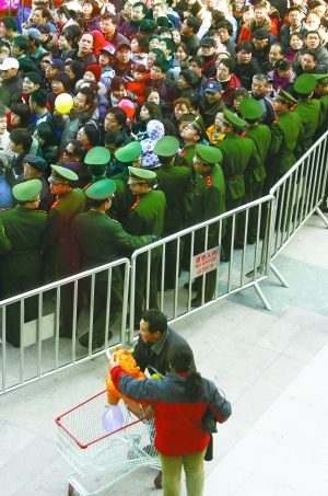 “新店開張,油、米、面、肉低價促銷,還發(fā)券,能不吸引人嗎?”李先生說,昨日上午9時許,他原準(zhǔn)備趕在超市剛開門就進(jìn)去轉(zhuǎn)轉(zhuǎn)。但一到萬達(dá)廣場,只見家樂福門口聚集著大量顧客,數(shù)百人的隊伍早就排至數(shù)十米外,并還在不斷膨脹。為維持秩序,工作人員在隊伍兩側(cè)安置了簡易護(hù)欄,同時,數(shù)十名武警一字站開,引導(dǎo)眾人進(jìn)入超市。