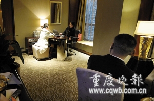 前來(lái)應(yīng)婚者在酒店房間里將資料交給親友團(tuán) 記者 冉文 攝