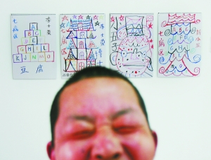 昨日,南京祖堂山精神病院八病區(qū),58歲的建筑工人張兵(化名)笑著在和張貼在藝術(shù)病房墻壁上的自己的畫作合影。當(dāng)天,江蘇省福利彩票發(fā)行中心捐贈(zèng)5萬元現(xiàn)金和7000元畫室用具,與南京祖堂山精神病院共同建立起全國第一個(gè)精神病院內(nèi)的藝術(shù)病房,激勵(lì)有繪畫創(chuàng)作潛質(zhì)的病人創(chuàng)作原生態(tài)的癲狂藝術(shù)之作。(本報(bào)記者 王申 魏銘言 攝影報(bào)道)
