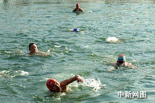本屆全國冬泳大賽設在大明湖北岸鉄公祠前的水域。因為大明湖是由泉水匯流而成,所以水溫在冬季也保持在10攝氏度左右。但由于今年濟南環(huán)城通航工程的開展,處于鉄公祠的入水口被暫時阻斷,泉水不能從這個入口流入,造成今年這里湖水的溫度比往年低了3—4攝氏度。而且上午當?shù)氐臍鉁卦诹阆?攝氏度左右,這向今年參賽的隊員提出了挑戰(zhàn)。
