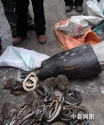 中新網(wǎng)吉林1月3日電(蒼雁)近千條野生錦蛇,一只海豚頭和刺猬在吉林市場被叫賣,1月3日,吉林市林業(yè)局稽查支隊(duì)查獲了這些在冬天里被捕殺的珍貴野生動物。