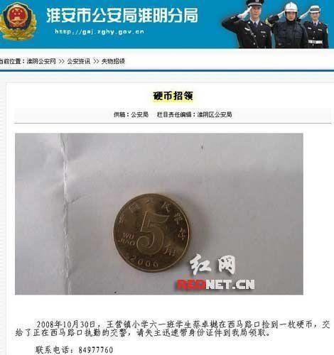 這則5毛錢招領(lǐng)告示系江蘇省淮安市淮陰公安分局所發(fā)。啟示稱,“王營鎮(zhèn)小學(xué)六一班學(xué)生蔡卓樾在西馬路口撿到一枚硬幣,交給了正在西馬路口執(zhí)勤的交警,請失主迅速帶身份證件到我局領(lǐng)取”。啟示上還附有照片,一枚銹跡斑斑的5毛錢硬幣,靜靜躺在照片里。據(jù)悉,這是他們根據(jù)上級(jí)的要求,作為政府信息公開的具體實(shí)施步驟,通過互聯(lián)網(wǎng)發(fā)布失物招領(lǐng)信息。記者搜索到5毛錢硬幣頁面已被刪除。不過,能通過“快照”看到。