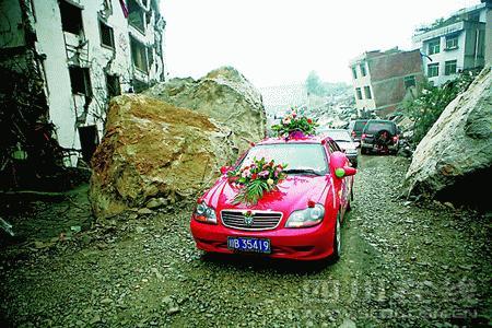 眼見一對貼著大紅喜字的結(jié)婚車隊擦肩而過,敏銳的遲阿娟跳下車拿著鏡頭緊追,“我以最快速度緊追行駛的迎親車隊,差點(diǎn)跑斷腸子……”未能打聽到進(jìn)一步信息,遲阿娟很遺憾:“他們說新人不能下轎,車子不能停留,新人不愿說出名字,更不愿留下電話,只是說:我們是北川人,地震雖然奪走了親人、財產(chǎn),但是,生活還是要繼續(xù)!”