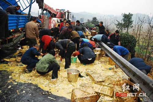 1月4日早晨6時(shí)40分,一輛滿載7噸鮮鴨蛋的湖北小貨車,由北往南行駛至京珠高速高速公路長潭段212公里時(shí),因躲避快速車道的一輛汽車超車側(cè)翻,10萬多只鴨蛋傾覆在近8米長的高速公路路肩上。附近近百村民聞?dòng)嵡皝砗鍝專F(xiàn)場一片狼藉。