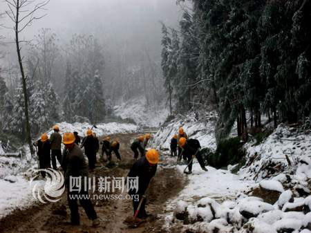 由于2008年12月底寒流影響,北川境內(nèi)氣溫急劇下降!1日凌晨,擂鼓鎮(zhèn)境內(nèi)高山地區(qū)就開始下雪了。”當(dāng)?shù)厝罕姼嬖V記者!1日下午,接到市交通局通知會(huì)議,研討擂禹路搶險(xiǎn)方案,2日就開進(jìn)隊(duì)伍進(jìn)行搶修,目前,B段搶修工程已接近尾聲。”B段維護(hù)工程隊(duì)負(fù)責(zé)人黃傳能說。“冒火山頂(C段)已經(jīng)結(jié)起了厚厚地一次冰,昨(4)日市、縣領(lǐng)導(dǎo)才去看了,根本無從下手!盉段維護(hù)隊(duì)挖掘機(jī)手周會(huì)林如是說。