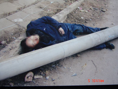 5日下午4時,汝州當?shù)貧鉁氐陀诹阆?度。中國網(wǎng)通汝州分公司門外被駐足的市民團團圍住。一名自稱姓任(音),是網(wǎng)通公司警務(wù)室工作人員的中年男子叉腰站在門口臺階上。他的身后,死者魯偉政8歲的兒子魯志恒和剛滿一歲的妹妹依偎在媽媽懷里,驚恐而無助的望著他。一番爭論后,任姓男子緩緩點燃一根香煙,指著身后席地而坐的家屬大聲叫道:“你們這樣做是違法的!”“再吵把你們?nèi)テ饋!”任姓男子的說法立即引起圍觀群眾的強烈不滿,現(xiàn)場的爭吵聲將原本躺在媽媽懷中熟睡的女嬰嚇得大哭起來。