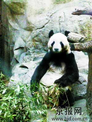 今天上午,記者在北京動物園熊貓館室內(nèi)展廳看到了“古古”,它正悠閑地坐在樹邊啃著竹子。竹子啃到一半,它的耳朵突然立了起來,一轉(zhuǎn)頭,只見一名飼養(yǎng)員站在它的小柵欄門外!肮殴拧被位斡朴频嘏懒诉^去,像人一樣站直身子等著飼養(yǎng)員喂食,領(lǐng)到“零嘴”后便一口吞了。飼養(yǎng)員離開后,“古古”卻依然直立著身子握著欄桿等著。