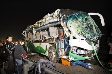 乘客張小姐,事發(fā)時坐在車廂左側(cè)第三排,“當時我睡得迷迷糊糊,忽然間車身劇烈搖晃,還聽到巨大的撞擊聲,等清醒過來時已發(fā)現(xiàn)整個車身右側(cè)都沒了,好多人頭破血流,太慘了!”大客車副駕駛董師傅回憶起當時的情形也是心有余悸,“我反應(yīng)稍慢一點的話就沒命了!碑敃r董師傅坐在大客車右前方的乘務(wù)員位置,“我在想事情,忽然發(fā)現(xiàn)前方有車時,一切都來不及了,于是趕忙起身往后跑,才躲過一劫。”