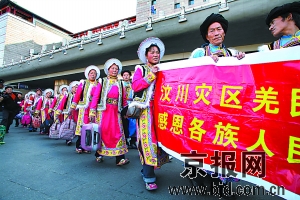 在排練基地,有26名穿著羌族服裝的演員非常引人注目,他們都是來自汶川、茂縣等地震重災區(qū)的村民,昨天中午1時剛剛抵達北京。