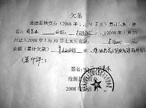 據(jù)了解,周顯本受永平縣聯(lián)合建筑安裝有限責(zé)任公司的委托,于2005年4月28日與滄源縣政府扶貧開發(fā)領(lǐng)導(dǎo)小組辦公室簽訂了《茅草房改造工程承包合同》,扶貧辦委托周顯本等農(nóng)民工生產(chǎn)制作水泥空心磚預(yù)定100萬塊,實際生產(chǎn)80多萬塊,每塊空心磚計價1.8元,合計人民幣165.412萬元。當(dāng)年工程完工后,周顯本等農(nóng)民工只領(lǐng)到了扶貧辦支付的78.664萬元,而工程余款69.4649萬卻只換來了一張白條。