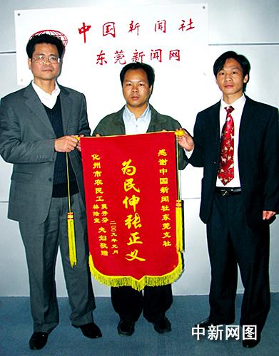 中新網(wǎng)東莞1月20日電(記者 李映民)在廣東省東莞市務(wù)工的農(nóng)民工林陸宣和莫秀芬夫婦今天給中國(guó)新聞社東莞支社送來(lái)了一面錦旗,以表達(dá)他們拿到被拖欠近兩年工資的喜悅心情。