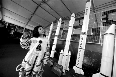 當(dāng)天下午,設(shè)在騰龍閣的航天科技體驗(yàn)場(chǎng)不斷有三五成群的游人進(jìn)出,神七返回艙的全尺寸模型、嫦娥一號(hào)的實(shí)物火箭殘骸、剛剛研制出來的長征五號(hào)運(yùn)載火箭的微縮模型……站在只有在電視上能見得到的航空物品前,小朋友拉著爸爸媽媽問個(gè)不停。旁邊,等待試穿宇航服的游客自發(fā)排起隊(duì),準(zhǔn)備過把“航天癮”!吧駳獍桑旖o我拍一張。”湖南來京務(wù)工人員張淼第一次逛廟會(huì),穿好宇航服后,他立即站到太空照片的背景前拍照留念。