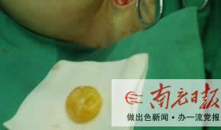 彭海濤事后分析,李娜曾在2007年進行自體脂肪移植手術,估計是手術醫(yī)生誤將部分脂肪注射到了胸大肌間隙之間,導致術后脂肪液化進而包裹形成包塊。因為脂肪包塊的色澤接近金黃色,所以乍一看很像個金燦燦的鴿子蛋。彭海濤表示,這一病例,原理和治療并不復雜,但是在全國非常罕見。為了讓病人放心,工作人員現(xiàn)場用棉簽戳破了“金鴿蛋”,里面露出黃色的液化脂肪。