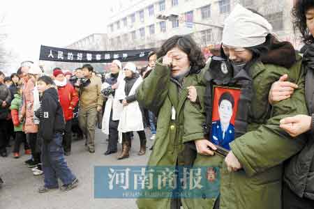 在前往遺體告別儀式舉行地——中牟縣殯儀館時,不足5公里的路段,送行的隊伍被4次攔住,行走了一個多小時。途中不少負責執(zhí)勤的交警,一只手在敬禮,而另外一只手則悄悄在抹眼淚。