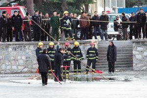 事發(fā)現(xiàn)場,吞噬了年輕男子的冰窟緊靠敬業(yè)湖南岸。公安、消防人員將敬業(yè)湖緊鄰北洋道一側(cè)的湖岸封鎖,7個(gè)民警沿著親水平臺走上冰面,用竹竿在冰下摸索著。時(shí)間一分一秒地過去,救援人員找來一塊長方形木板,當(dāng)作筏子艱難地破冰搜救。一個(gè)半小時(shí)過去了,救人的“筏子”漸漸向湖心移動,搜索的竹竿在一米一米地加長,但水下沒有一點(diǎn)動靜。
