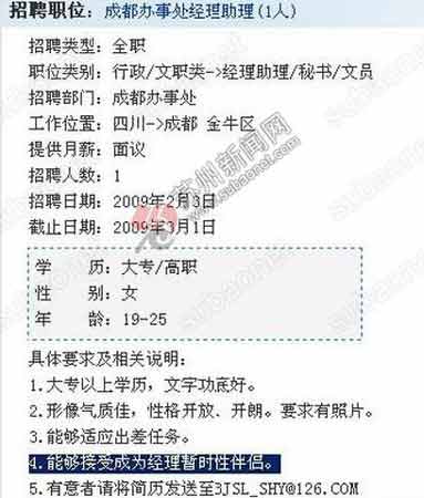 2月3日下午,成都招聘網(wǎng)上一條招聘信息讓網(wǎng)友驚詫不已,這是北京某科技公司成都辦事處招聘一名經(jīng)理助理,要求女性,大專、高職即可,年齡在19至25歲,以及其他一些常規(guī)招聘要求。隨后在“具體要求和相關(guān)說明”一欄中,有兩條要求別出心裁,是眾多求職網(wǎng)友從沒見過的。第二條:形象氣質(zhì)佳,性格開放、開朗。要求有照片;第四條:能夠接受成為經(jīng)理暫時(shí)性伴侶。招聘信息中還留有招聘單位的聯(lián)系人、電話和郵箱。