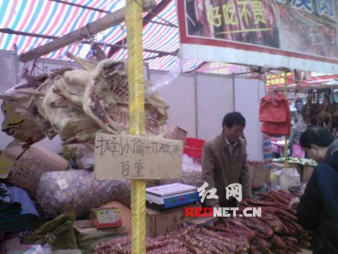 照片顯示:一個簡陋的肉類食品攤位,攤位前擺放著臘腸、熏臘肉等肉制品,一名中年男子攤主正和一名顧客進(jìn)行買賣交易,攤位頂上掛著整頭的干豬肉,四周是零亂地堆滿了一些紙制品包裝箱、紅色塑料盆,攤位掛著“好吃不貴”條幅,最為顯眼是支撐攤位的一根本柱上用一塊硬紙板上用毛筆寫著警示牌。