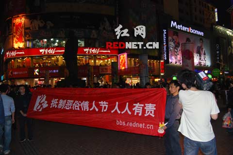 “快來看,抵制惡俗情人節(jié),人人有責(zé)!這活動真好,你還過什么情人節(jié)啊?!”12日晚上7點(diǎn)半,在長沙黃興南路步行街上,兩名男子拉起了一個約四米長一米寬的抵制情人節(jié)的橫幅,引起了許多路人的興趣,還有不少人上前簽名表示支持這種活動,橫幅上簽有許多秘密麻麻的支持該活動的留言,當(dāng)然,還吸引來了長沙各大媒體來采訪,也有人認(rèn)為這有作秀的嫌疑,可謂眾說紛紜。