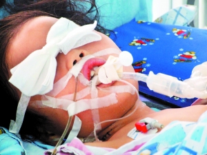 黃蓉今年6歲半,四川人。上了呼吸機(jī)的黃蓉被蒙著雙眼,躺在病床上,雖然有心跳,但對外界的刺激毫無反應(yīng)。主治醫(yī)生說,其病情危重,“已接近腦死亡”。