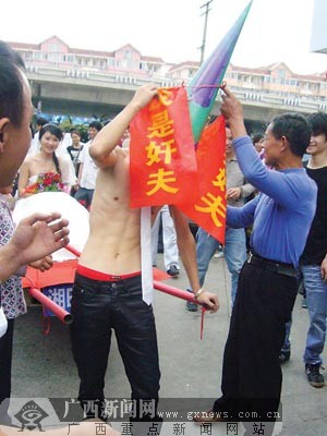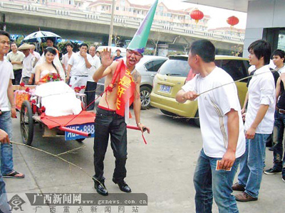 2月16日下午3時許,記者在南寧市葫蘆鼎大橋上看到了這支接親隊。走在最前面的新郎手拉一輛“牌照”為“湘E-88888”的平板車,平板車雖顯破爛,卻布置一新,上面還掛著橫幅“我是毛××今天討婆娘”。新郎的頭頂上還戴了一個錐筒形狀的綠帽,臉則被畫得滑稽非常,脖子上系著一條略顯夸張的白領帶。他上身并未穿衣,只掛著綢緞,上書“我是奸夫”字樣。
