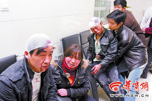 在鳳城醫(yī)院急診科,看見丈夫陳國權(quán)滿臉血跡,頭裹紗布無力地靠在大廳的椅子上,王克云立即失聲痛哭。陳國權(quán)說,頭上剛縫了6針。鐘文榜傷勢更嚴重,滿臉的血跡已凝結(jié),頭裹紗布,左腿已不聽使喚。“他們兩人打我一個。”鐘文榜說。自己看見打人的頭戴著紅色的安全帽,上面有“中國華西”幾個字!笆俏(在外面)報的警,他們看見我報警了,追出來把我一陣亂打。”一旁的王克清邊說邊流淚。