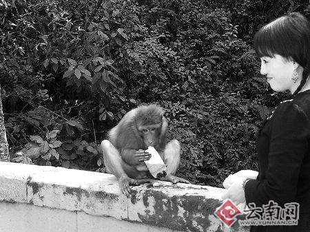 當時,兩只猴子正一前一后站在公路旁的擋墻上,一邊來回走動啃食游客“進貢”的食品,一邊不斷發(fā)出“唬!钡暮鸾新,仿佛是在對圍觀的游人說:“快進貢些好吃的來,不然休想打此經(jīng)過。”而一旁已有數(shù)輛路經(jīng)此地的車?吭诼愤,10余名游客正興致勃勃地圍著兩只猴子觀看,幾名膽大的游客正在接受猴子的命令,乖乖地向猴子奉上隨車攜帶的食品,以供他們享用。