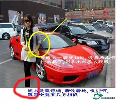 疑點二:從照片中女子與法拉利之間的距離,以及人與車的大小比例看,照片有明顯的PS痕跡。女子的腳甚至沒有拍進照片內法拉利旁的地面上,這從整個照片的拍攝角度來看,是不可能的。