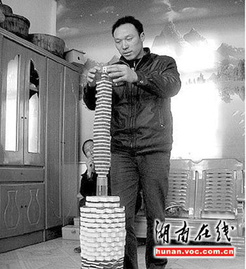 用一個麻將子頂起26副(2800多個子)麻將,凈高達到3米,你見過嗎?湘潭縣姜畬鎮(zhèn)31歲的彭樹炎經(jīng)過8年苦練,練出這樣一手絕活。他盼著能創(chuàng)造一項吉尼斯世界紀錄。