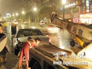 目擊者劉先生介紹,9時(shí)50分左右,當(dāng)事尼桑跑車從北城天街方向飛馳著上行,駛向江北歐式一條街。在歐式一條街中段,尼桑失控,撞向路邊的路燈電桿!芭椤钡囊宦曧懞,電桿“巍然不倒”,尼桑車卻來(lái)了個(gè)180度的大轉(zhuǎn)彎。當(dāng)晚10時(shí)10分左右,記者在現(xiàn)場(chǎng)看到,這輛車牌號(hào)為渝AE3183的尼桑跑車車頭被撞得四分五裂,路面上散落著車燈,鐵皮等碎片。目擊者劉先生說(shuō),事發(fā)后,車上兩人毫發(fā)無(wú)損,但下車后不知去向。