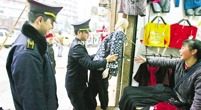 記者在沙坪壩區(qū)天陳路看到,臨街的公苑旅館在窗外懸掛被單,3名城管隊(duì)員連忙趕去,幫助店主收拾被單,臨走時(shí)丟下一句溫馨提醒“請記住,以后不要隨意懸掛物品”,整個(gè)過程只用了5分鐘,并未開罰單,店主十分滿意。10:10,記者看到,石碾盤一家服裝店剛購進(jìn)2個(gè)模特兒,女店主一人無法搬移,2 名城管隊(duì)員連忙上去幫忙。10:20,天陳路一個(gè)“傳統(tǒng)包”店前,2名城管隊(duì)員正熱情幫助店主搬蒸鍋。旁邊的“泰國香米蛋糕”店門前,也有城管隊(duì)員在幫忙。