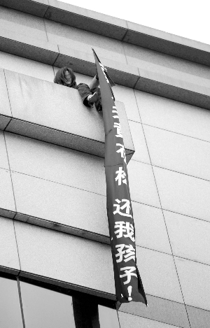 記者看到,一名身穿紅色外套的年輕女子,正坐在樓頂外墻伸出的一小塊天臺(tái)邊緣,垂著頭發(fā),兩腳懸空,一只手抓著手機(jī),另一只手拉著一條條幅,上面寫著“還我孩子”等幾個(gè)白色大字。圍觀的人越來越多,記者回頭望去,只見淮海路一側(cè)的自行車道上,整片黑壓壓的腦袋。