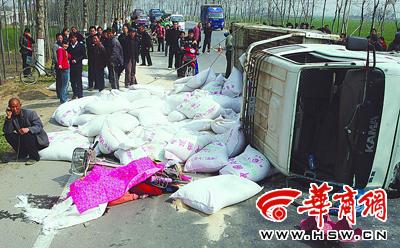記者在現場看到,一輛車號為陜A17243的小貨車側翻在馬路北邊,車窗玻璃全部破碎,車上拉的麩皮撒落二三十米。靠近馬路邊的一塊破布下,身穿紅色褲子的王維維壓在自行車下。