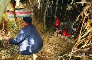 知道兒子又發(fā)瘋后,楊付于夫婦當(dāng)晚就請村民幫忙,將兒子捆了起來。此前,楊盛敏曾先后有過兩次毆打老人的行為。由于給兒子治病和賠償兒子打砸村民財產(chǎn)的損失,夫婦倆已債臺高筑,再也拿不出錢送兒子去醫(yī)院治病了。為了不讓兒子撞禍,傷害到村民,同時避免村民們憤怒之下傷害到兒子,經(jīng)過一個難眠之夜,兩位老人第二天作出了一個痛苦的決定:請人幫忙用鋼筋焊了一個鐵籠,將兒子鎖了進去,并給他的手腳帶上鎖鏈。為了不讓兒子歇斯底里的叫喊聲影響到村民們的正常生活,他們還將鐵籠子放到距村子七八百米遠的小山上。