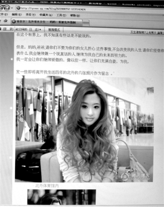 3月16日凌晨2點(diǎn)57分,“北外香水女生”發(fā)表題為《媽媽?zhuān)何冶槐蓖鈴?qiáng)制退學(xué)了》的文章。該文稱(chēng),德語(yǔ)系劉老師找她談話(huà),說(shuō)她的博客直接攻擊教育部,給學(xué)校領(lǐng)導(dǎo)造成很大的壓力,催她寫(xiě)退學(xué)申請(qǐng)。校方要求其家長(zhǎng)迅速抵京辦理手續(xù)。