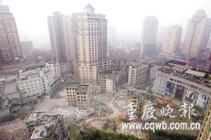 “轟!”昨天早上8點(diǎn),伴隨著一聲巨響,江北觀音橋商圈渝北二村二號(hào)地塊的6棟居民樓瞬間倒塌,整個(gè)過(guò)程僅有1.5秒,絲毫未影響到周?chē)芗木用駞^(qū)和各種管網(wǎng)。據(jù)悉,這是今年我市危舊房改造的第一爆,爆破原址將建200多米高五星級(jí)酒店,成為江北第一高樓。